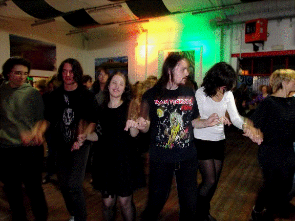 Nadia e Germano dei Gens d'Ys ballano con noi al Mirimaru di Garbagnate Milanese nell'inverno del 2001.